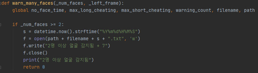 시험 도중에 두명 이상의 얼굴이 감지되었을 경우, 모여서 시험을 응시하는 행위로 의심할 수 있다. dlib의 얼굴 감지 함수를 통해 얼굴을 인식하였으며, 만약 두개 이상의 얼굴이 감지되었을 경우, 경고 메시지를 표시하며, 특정 시간동안 해당 기능은 비활성화된다. 해당 과정을 구현한 수도코드는 아래와 같다.