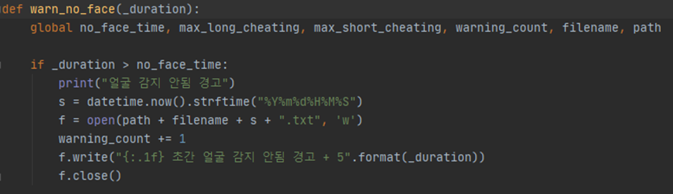 마지막 네번째 기능은 응시자의 웹캠에 응시자의 얼굴이 일정시간 이상 감지되지 않았을 경우 경고 메시지를 전송하는 기능이다. 시험 도중에 일정시간 이상 얼굴이 감지되지 않을 경우, 컨닝페이퍼를 보거나, 무단으로 시험장을 이탈하는 행위를 의심할 수 있다. 해당 기능 역시 dlib의 얼굴 감지 함수를 통해 얼굴을 인식하였으며, 만약 특정 시간 이상 얼굴이 감지되지 않았을 경우, 경고 메시지를 표시한다. 해당 과정을 구현한 수도코드는 아래와 같다.