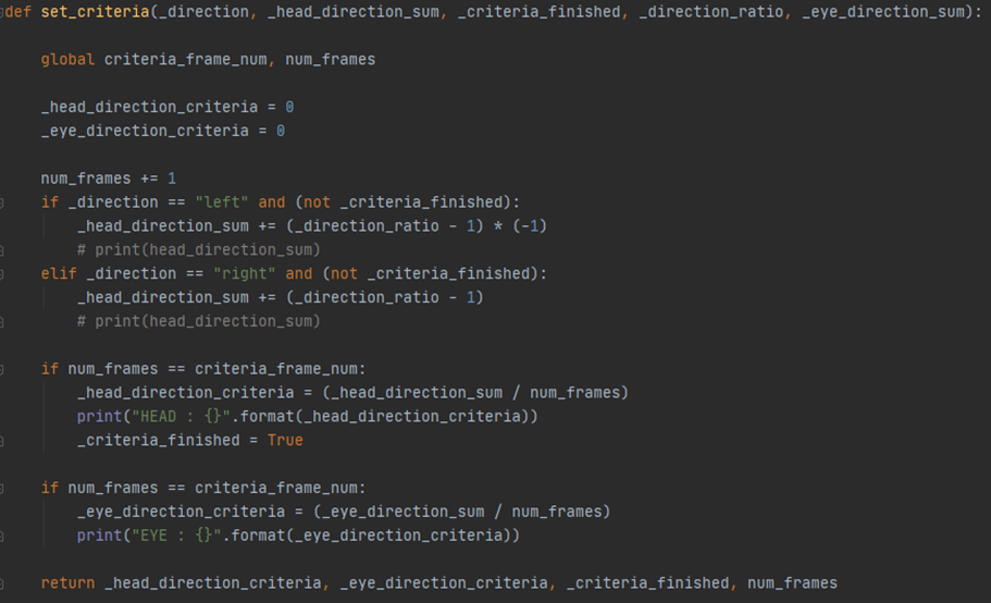 따라서 응시자가 Argos 프로그램을 실행하고 일정 기간동안 측정된 눈동자와 고개의 회전 정도를 기준으로 설정하게 된다. 기준을 설정하는 과정을 구현한 수도 코드는 아래와 같다.