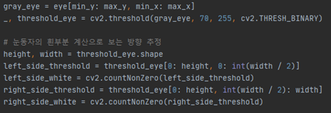 해당 기능을 구현하기 위해 dlib 라이브러리와 OpenCV 라이브러리를 활용하여 응시자 얼굴의 눈을 탐지하였으며, 탐지된 눈을 이등분하여 오른쪽과 왼쪽에 포함된 흰자의 비율을 파악하였다.
