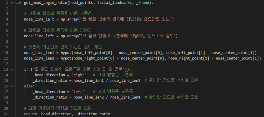 앞서 파악한 응시자의 얼굴에서 코 끝과 양 입술 끝을 파악하여 선으로 연결하였다. 연결한 두 선의 길이 비율을 계산한 뒤, 해당 비율을 통해 응시자의 고개가 어느정도 회전하였는지 파악하였다.