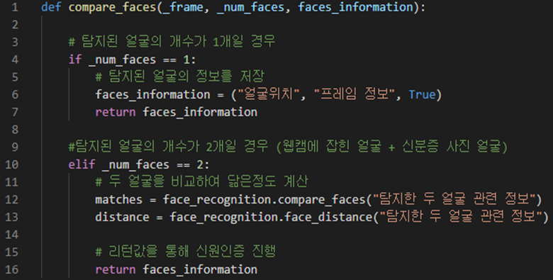 해당 라이브러리를 통해 인식된 두 얼굴 사이의 distance를 숫자로 나타낼 수 있는데, 해당 값이 1에 가까울수록 서로 얼굴이 다르다는 의미이다. 신원 인증을 진행하는 과정 도중에 얼굴이 2개 감지될 경우, 신원인증이 자동으로 시작되며, distance 값을 기준으로 신원이 일치할 확률을 표시하였다. 해당 코드를 구현한 수도코드는 아래 그림과 같다.