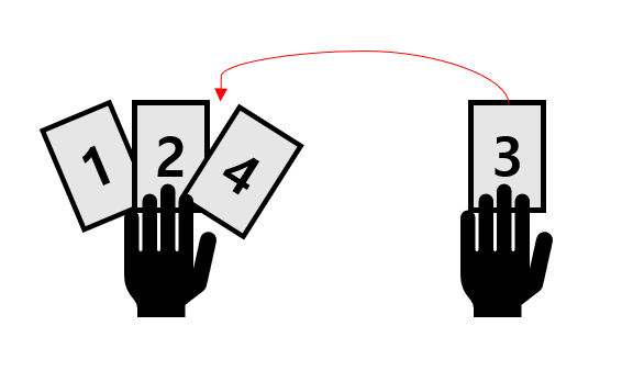예를 들어 왼손에 [1, 2, 4] 이렇게 정렬된 카드들을 가지고 있고, 오른손에 있는 여러장의 카드 중 [3] 에 해당하는 카드를 선택했을 경우, 왼손으로 옮기며 적절한 위치인 '2와 4 사이'로 옮긴다.