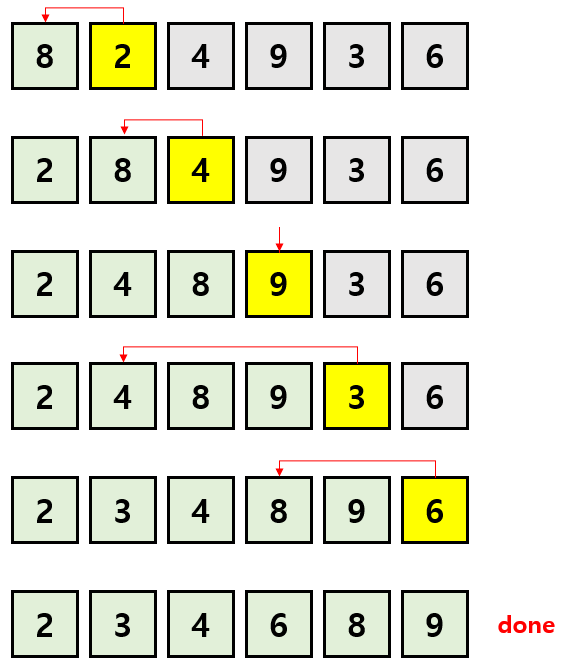 아래의 예시에서 노란색으로 선택된 숫자가 key 값이며, 해당 key 값은 왼쪽의 배열 중 적절한 위치로 가게 된다. 또한 이미 정렬된 상태의 배열은 연두색으로 표현하였다.