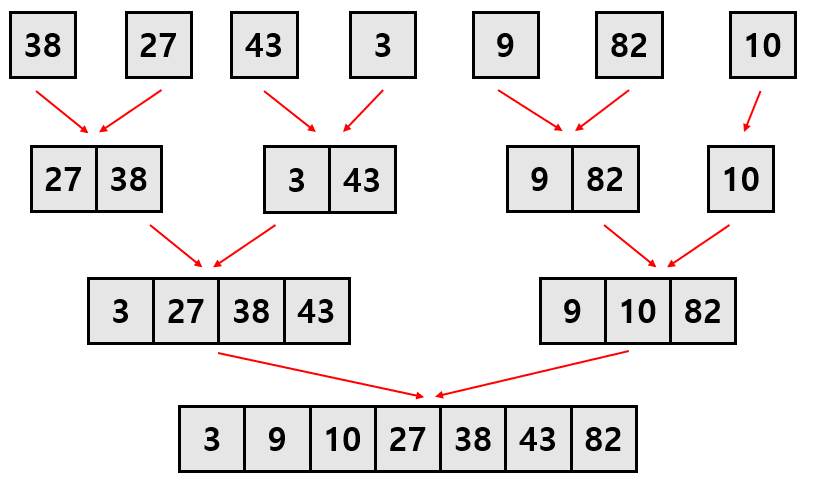 사실 전체 sequence를 크기가 1이 될 때까지 쪼개는 과정은 간단하다. 핵심적인 부분은 쪼개진 녀석들을 merge 하면서 정렬하는 단계인데, 다음과 같은 방법을 사용한다.