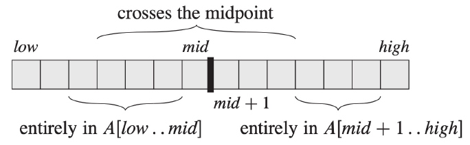 Maximum-subarray을 풀때는 아래와 같이 3가지 경우로 나누어 문제를 풀어나간다.