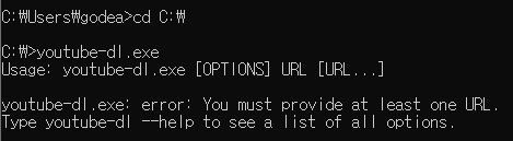 이제 "./youtube-dl.exe" 라는 명령어를 치면 아래 그림과 같은 에러가 나올 것인데, 이러면 일단 1단계는 성공한 것이다.