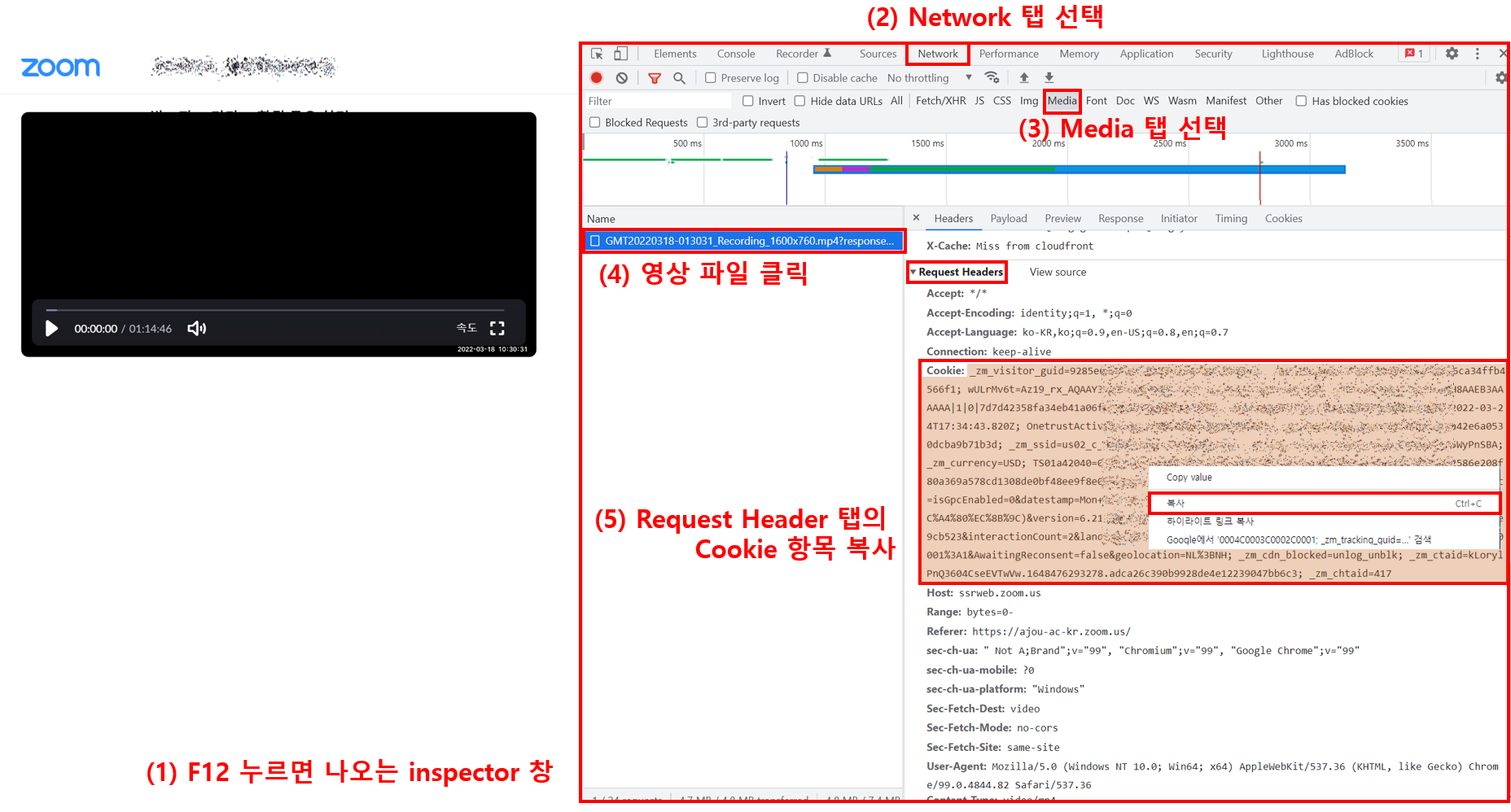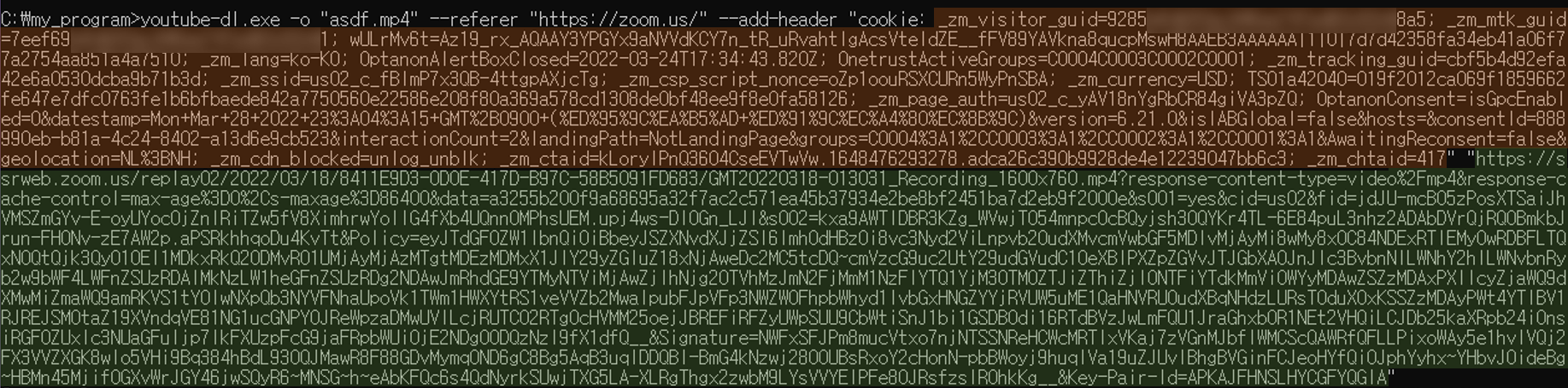 C:\> youtube-dl -o "[동영상파일명.mp4]" --referer "https://zoom.us/" --add-header "cookie: [Cookie 값]" "[Requested URL 값]"