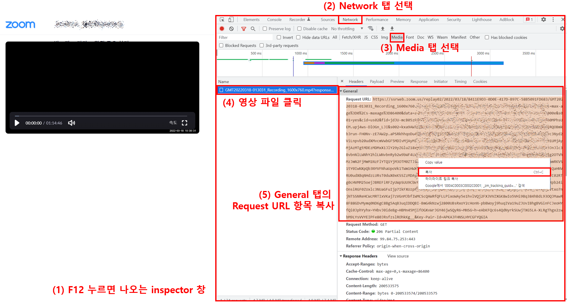 일반적으로 mp4 영상을 서버로부터 그대로 받아오는 웹페이지의 경우에는, 개발자 도구에 들어가서 mp4 영상 소스 링크를 통해 웹에서 바로 다운받을 수 있지만, zoom recordings 같은 경우에는 위와 같은 방법이 불가능하다.