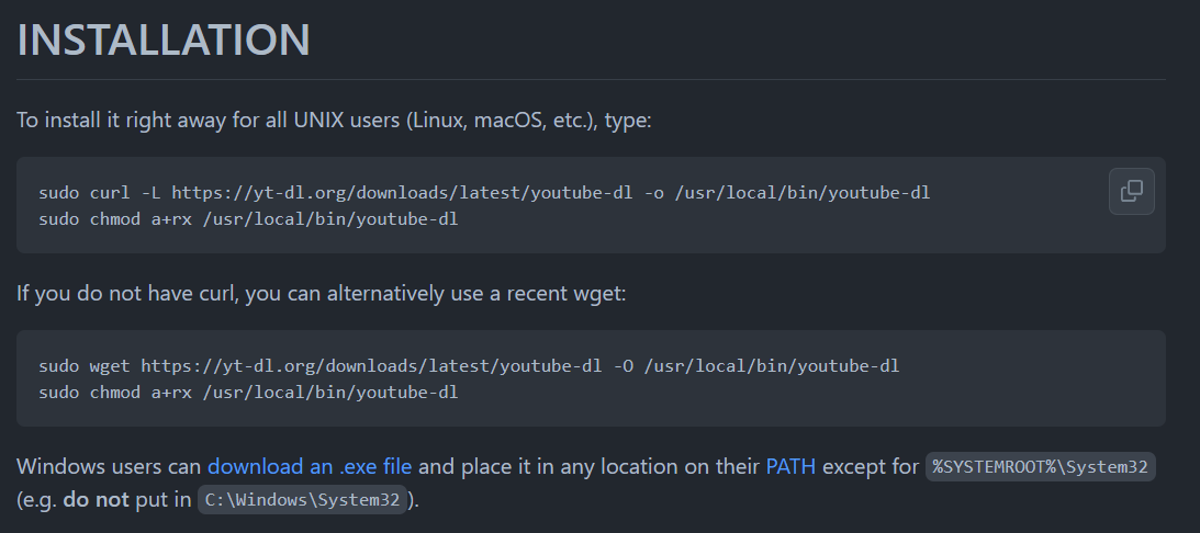 위의 링크로 접속하면 youtube-dl이라는 프로그램을 다운로드 받을 수 있다.