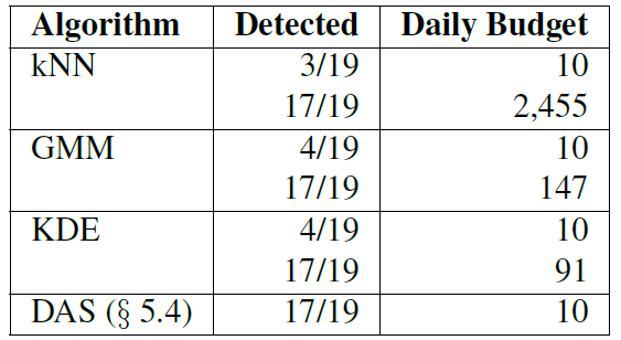 그림에서 볼 수 있듯이 기존의 anomaly detection 시스템은 DAS 에 비해 25% 정도 낮은 성능을 보였으며, DAS가 탐지한 공격을 모두 탐지하기 위해서는 엄청난 양의 alert budget 이 필요함을 알 수 있다.