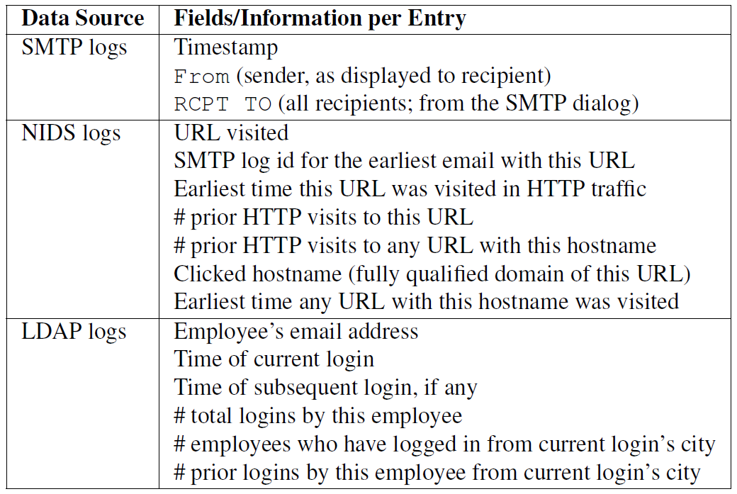privacy 이슈를 해결하기 위해 개인정보는 모두 keyed hash 등의 방법으로 익명화하였고, 메일의 bodies / webpages는 포함하지 않도록 하였다. 아래 [그림 2] 는 사용된 데이터셋에 정보를 나타내고 있다.