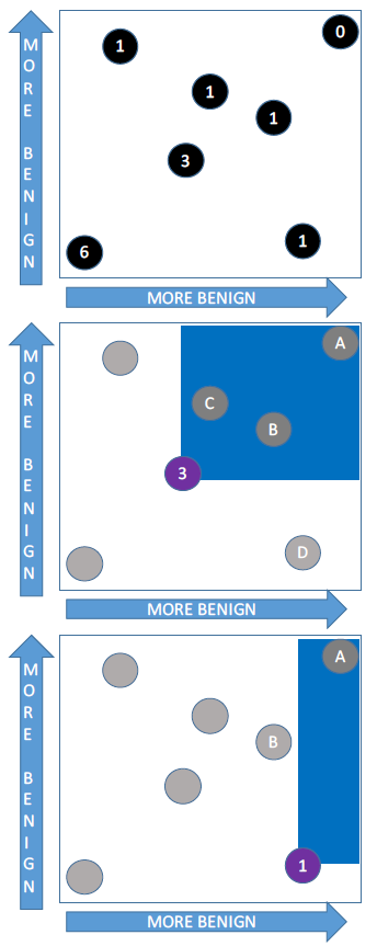 아래 [그림 5]의 세번째 그림을 보면, 보라색 event는 B event에 비해, y축 관점에서 더 malicious 하지만, x축 관점에서는 더 benign 하므로, B event는 보라색 event의 socre를 올리지 못한다.