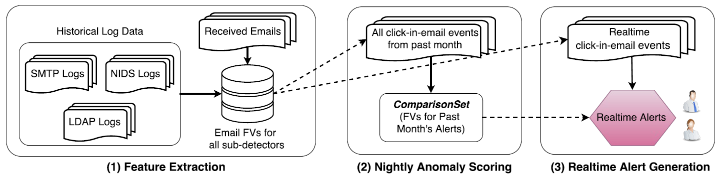 크게 3단계로 이루어져 있는데, 1) feature extraction stage 2) nightly scoring stage 3) real-time alert generation stage 로 이루어져 있다.