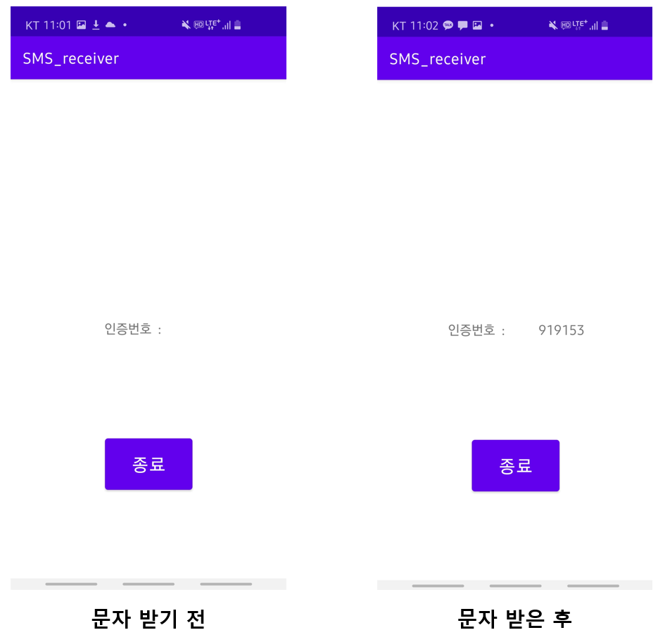 이렇게 Broadcast Receiver를 통해 수신한 문자 내용을 parsing 하여 6자리 숫자코드를 획득한 뒤, 본 어플에 띄워주면 끝이다. (간-단)