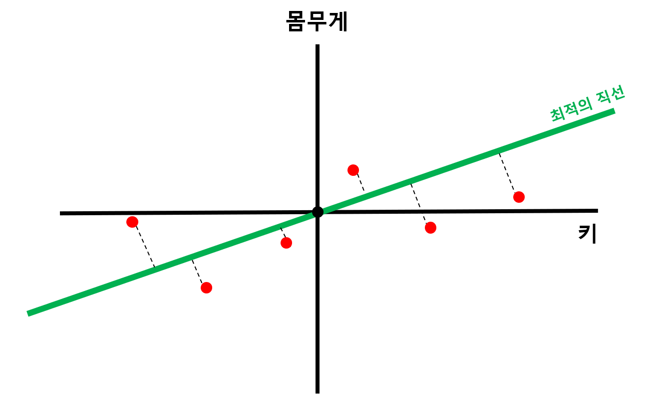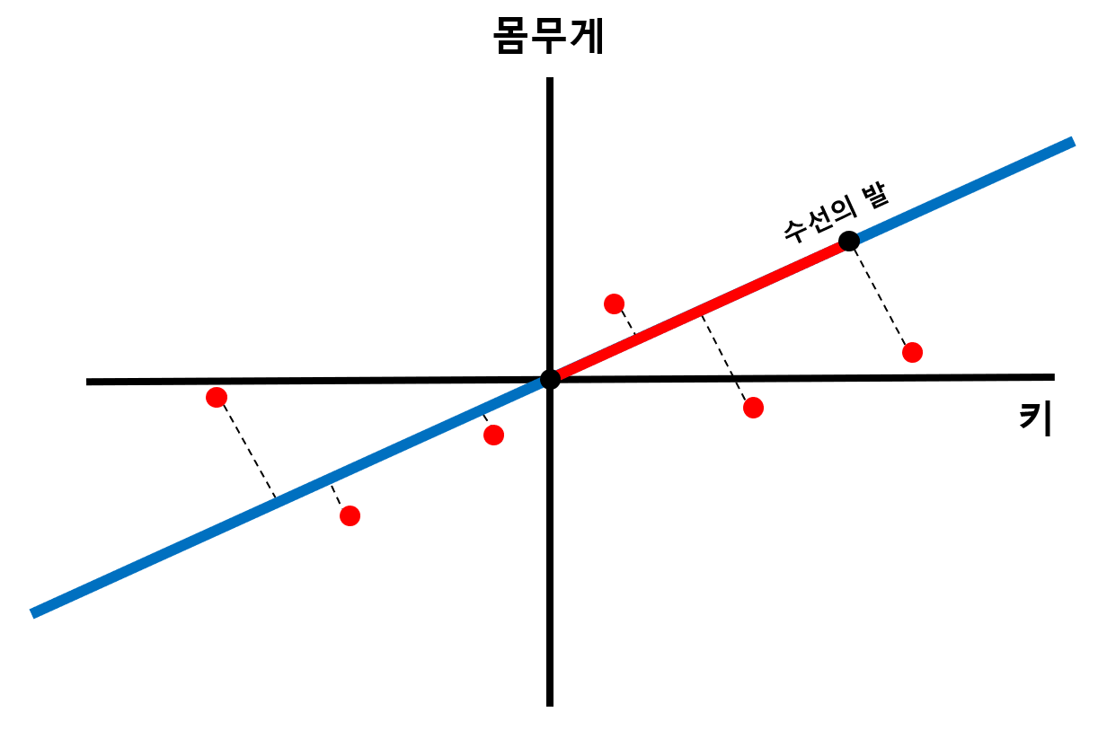 위 그림처럼 모든 데이터에서 원점을 지나는 직선에 수선을 발을 내리면, 원점으로부터 수선의 발까지의 길이를 구할 수 있게 된다. (빨간 직선. [그림 4]에서는 한 점에대한 길이만 구했지만, 실제로는 모든 점에 대한 길이를 구해야 한다.)