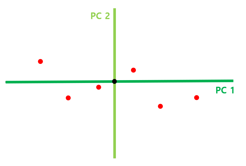 앞서 구한 PC1과 PC2 직선을 각각 x축, y축이 되도록 데이터를 회전시키면 위의 그림과 같이 된다.