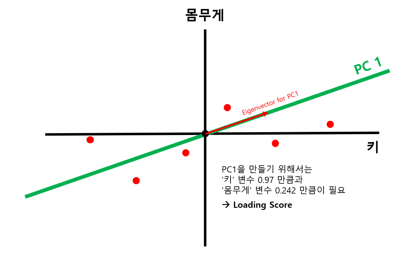 STEP 3) 찾은 직선을 PC1으로 설정하고, loading score 구한다.
