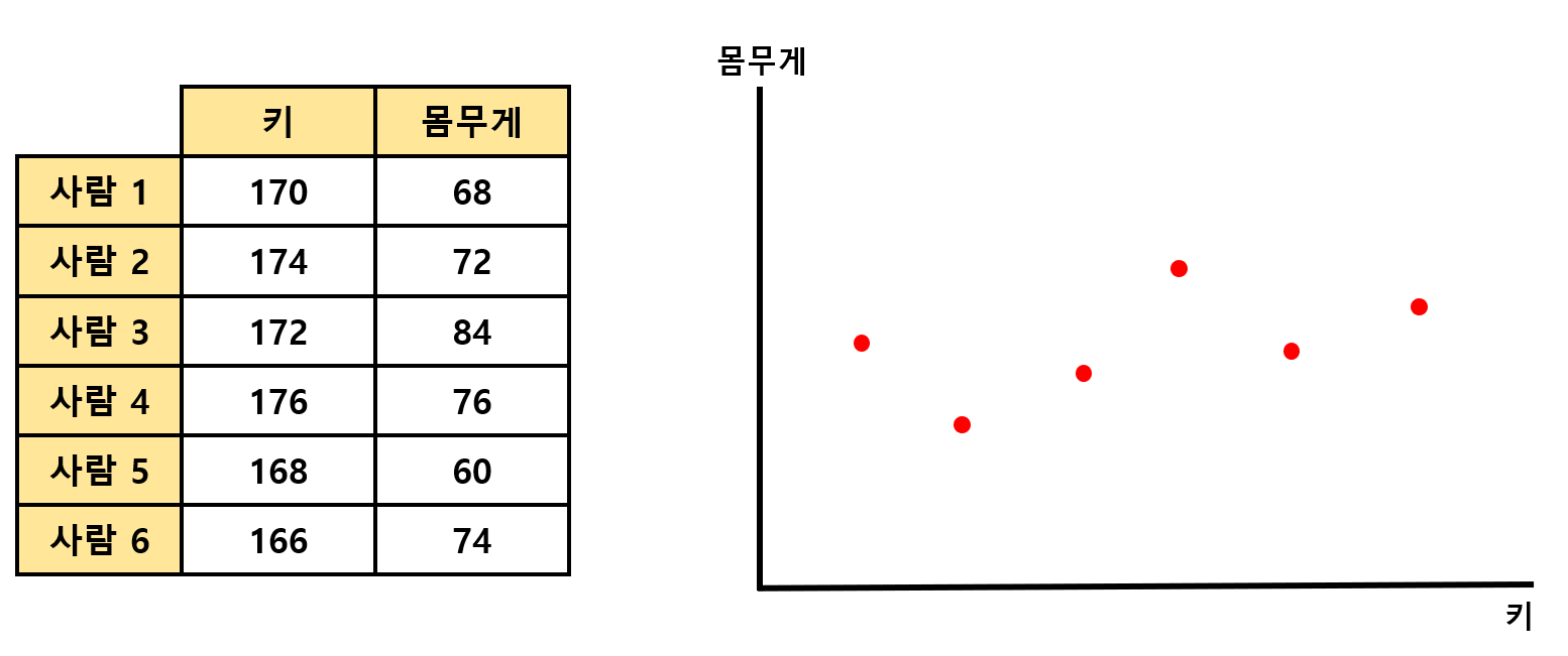 아래 [그림 2]의 표와 같은 데이터가 있다고 생각해보자. 각 cloumn 은 사람들의 키와 몸무게에 대한 정보를 의미하며, 각 row는 여러 사람들의 샘플을 의미한다.