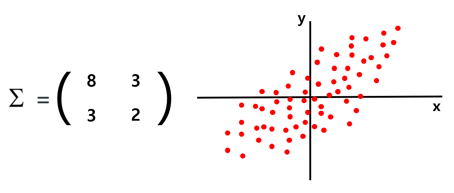 예를들어 [그림 15] 와 같은 covariance matrix가 있다고 해보자. x의 variance는 y의 variance보다 크므로 데이터는 가로로 길쭉한 형태가 될 것이며, x와 y의 covariance가 양수이므로 1, 3 사분면을 지나는 오른쪽 그림과 같은 형태가 될 것이다.