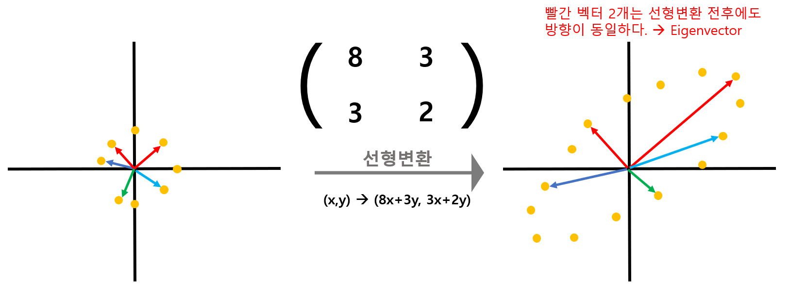 변환된 수많은 벡터들 중, 빨간색으로 표시된 벡터 2개만은 변환 전과 후의 방향이 동일하다.