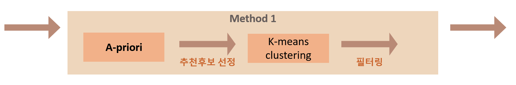 K-means clustering을 통해 사용자로부터 입력 받은 선호 영화 5개의 cluster들을 각각 구한 뒤, A-priori 알고리즘을 거쳐 나온 추천 영화들이 해당 cluster 중 어느 cluster에도 속하지 않은 경우, 해당 영화는 필터링하는 방식으로 진행하였다.