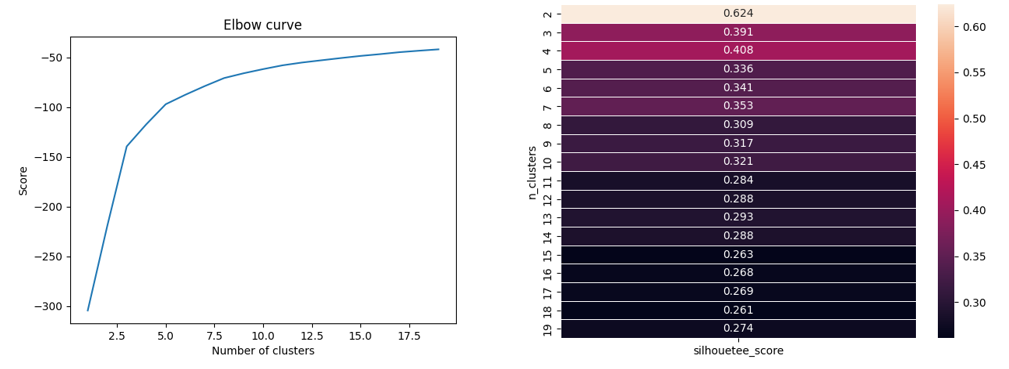 본격적으로 clustering을 적용하기 위해 sklearn 라이브러리의 KMeans 메소드를 활용하였다. cluster의 개수는 [그림 4]와 같이 elbow curve와 silhouette score를 기준으로 평가한 결과를 바탕으로 5로 설정하였다.