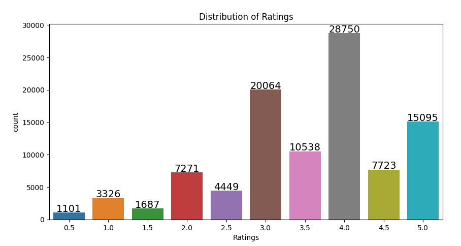 전체적인 rating 분포를 보기 위해 matplotlib 라이브러리를 사용하여 ratings_small.csv 파일을 분석하여 그래프로 나타낸 결과, [그림 1]과 같이 4.0 이 가장 많았고 3.0과 5.0 이 뒤를 이었다.