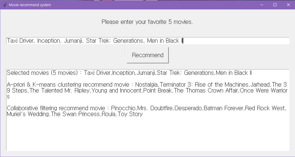 앞서 A-priori 알고리즘을 통해 추천된 영화들 중, 입력한 선호 영화들의 cluster에 포함되지 않은 영화들은 제외하였다. 이를 통해 A-priori 와 K-means Clustering 알고리즘을 융합하였다.