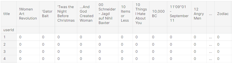 [그림 3]과 같이 row에는 사용자의 userId, column에는 영화들의 movieId를 배치하였고, Data frame 내부에는 각 userId와 movieId에 해당하는 ratings가 오도록 utility matrix를 생성하였다.