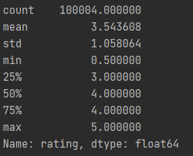 가장 적은 rating 값은 0.5였고, 1.5와 2.5가 뒤를 이었다. pandas 라이브러리의 df.describe() 메소드를 이용하여 전체적인 통계 정보를 출력한 결과 [그림 2]와 같았다.