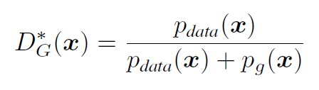 우선 Proposition 1을 보면, 만약 G가 fix 되어 있을 때, D는 [그림 4]와 같은 분포의 optimal 을 가지며, 이를 objective function에 대입해보면, [그림 5]와 같은 결과가 나타난다.
