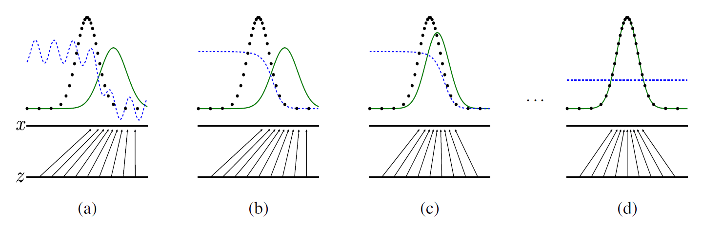 (a)나 (b) 그림을 보면 알 수 있듯이, 이렇게 mapping 된 확률변수들은 실제 데이터인 검은색 점과는 다른 초록색의 확률 분포를 가지게 된다. 이렇게 될 경우, 파란색 점선으로 표현된 discriminator model의 분포 역시, 두 데이터를 명확하게 분별할 수 있는 모습을 가지게 된다.