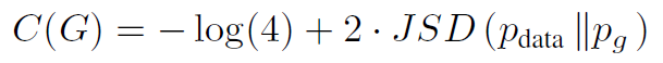 [그림 6]의 식의 최솟값이 -log 4임을 알수 있고, 이 경우는 Pdata = Pg 일 때 성립된다. 해당 기댓값 공식을 KL divergence 값으로 정리해보면 [그림 7]과 같이 나타낼 수 있으며, 이를 조작하여 하나의 JSD divergence로 나타내보면, [그림 8]과 같다.