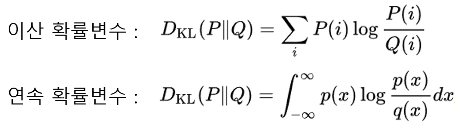 이산 확률변수와, 연속 확률변수에서 KL divergence를 구하는 수식은 [그림 1]과 같다.