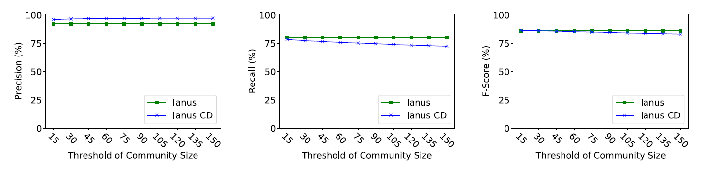 Ianus-FS-CD는 Ianus-FS와 Ianus-CD를 모두 고려한 시스템으로, 총 두개의 threshold 값을 고려하게 된다. feature sum의 값이 4일 경우 가장 성능이 좋았으며, 그 경우 community size의 threshold 변화에 따른 성능은 [그림 14]와 같았다.