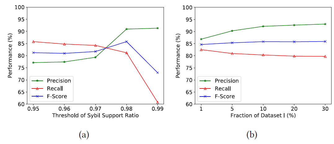 [그림 10]의 a에서 확인할 수 있듯이 threshold of sybil support 가 0.95에서 0.98로 증가할수록 Precision은 증가하고 Recall이 감소하는 것을 확인할 수 있었다.