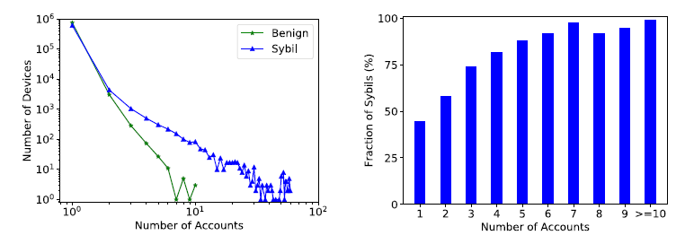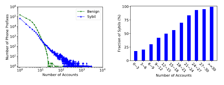 measurement 결과, IP 와 거의 비슷한 경향을 나타냈는데, 그 결과는 [그림 3]과 같다. Sybils account일 경우 특정 전화 번호에 몰리는 경향이 있으며, 비교적 많은 수의 accounts 들이 동일한 전화 번호를 사용할 경우, sybil account일 확률이 높았다.