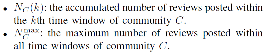 Nc(k)는 community C의 k번째 time window에서 작성된 누적 리뷰 수이고, Nc_max는 C의 전체 time window 중 가장 많은 리뷰가 작성된 수 이다.