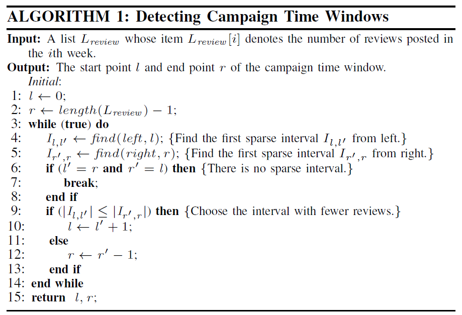 앞서 찾은 Sybil community 중에서 Sybil Campaign이 실행되는 시간 구역을 나타내는 Campaign Window를 찾기 위해, 리뷰의 rating이 갑자기 증가하는 때를 찾는 burst detection algorithm (예를 들면 Bayesian change point detection algorithm) 을 사용할 수도 있지만, 특정 프로모션 할인과 같은 이벤트때문에 rating이 갑자기 증가할 수도 있기 때문에 해당 방식은 문제가 있다.