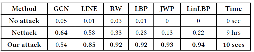 게다가, [그림 8]에서 볼 수 있듯이 대표적인 GNN 대상 공격인 Nettack에 비해서도 높은 공격 성공률과, 압도적으로 짧은 공격 시간을 달성하였다.