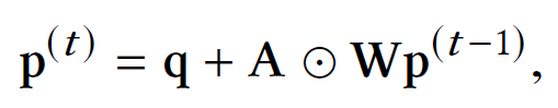 이제 부여한 prior score 를 기반으로 propagation을 진행한다. 아래 [그림 2] 와 같이 propagation을 진행하게 되는데, 저기서 q가 앞서 할당한 prior score 벡터이고, A가 그래프의 연결관계를 나타내는 adjacency matrix, W는 그냥 가중치 matrix인데 무시해도 된다.