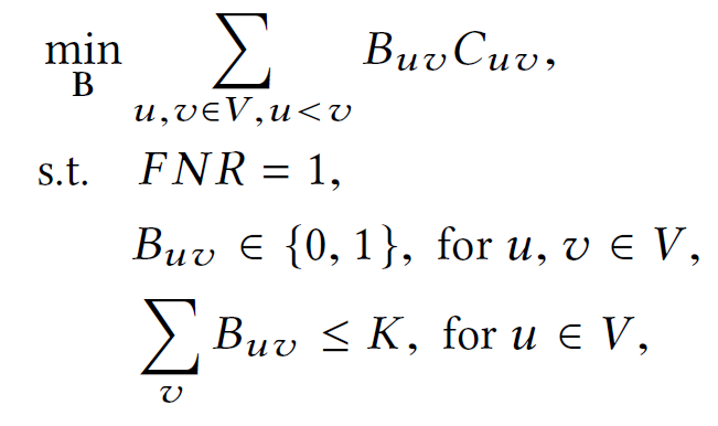 우선 C 행렬은 임의의 노드 u, v 사이의 edge 를 조작할 때 드는 cost 이고, B 행렬은 original graph와 manipulate 하려는 graph 사이의 변화를 나타낸다.