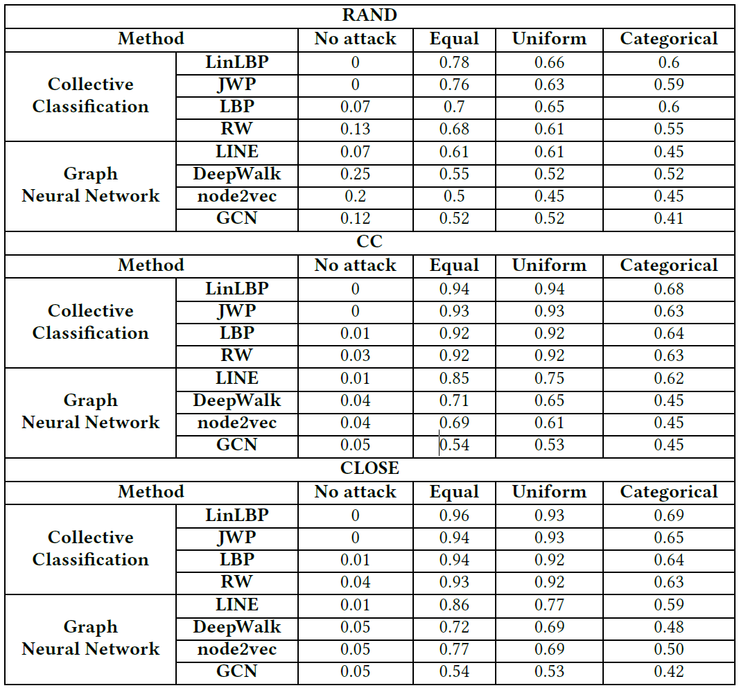 공격 결과는 [그림 6]과 같다. 표에 있는 RAND, CC, CLOSE 는 target node를 선택하는 방법이고, Equal, Uniform, Categorical은 cost matrix에 값을 할당시키는 방법을 의미한다. (그닥 중요한건 아니므로 설명하지 않고 넘어가겠다.)