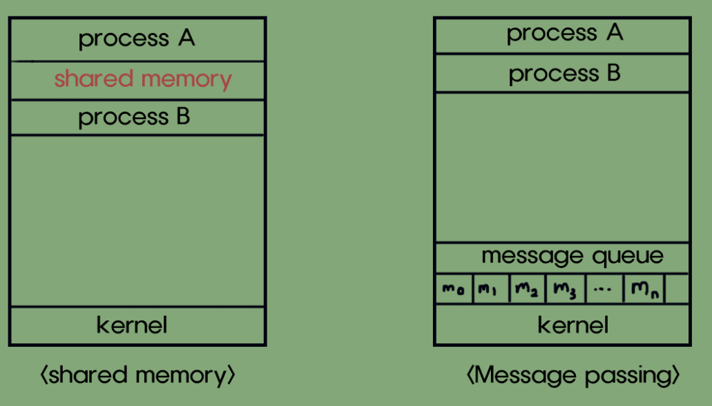 1. 프로세스끼리 소통할 때 Shared memory 모델과 Message passing 모델이 있다.