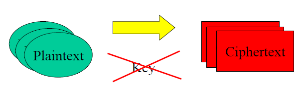 - 오로지 암호문만을 가지고 평문이나 키를 찾는 과정 (암호화알고리즘은 알수도 있음)