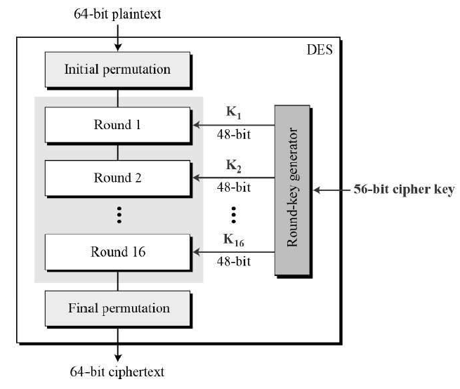 중요한 특징은 56비트 키를 이용한다는것과 매 라운드마다 48비트 키를 사용한다는 것이다.