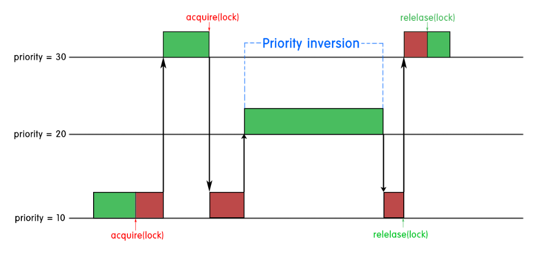 위의 그림에서 보면, low task가 lock을 잡고있는동안, high task가 실행이 되었고, 이 high task가 low task의 자원이 필요해서 마저 처리를 하라고 돌려보내줘서 low task가 자원을 처리하는 동안 middle task가 갑자기 두둥등장해서 priority를 뺐어가버린다. 이 동안 low task 가 자원 처리를 못마쳐서 high task가 계속 못돌아가는 것이다...!