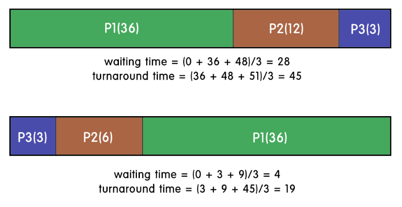 위의 그림에서 첫번째 경우가 대표적인 convoy effect이다. P1때문에 P2와 P3가 굉장히 오래 기다리는 것을 확인할 수 있다.
