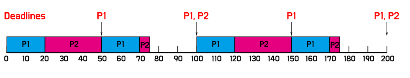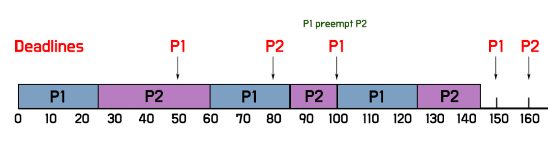 처음 P1과 P2가 들어왔을 때, P1이 주기가 짧으므로(=rate가 높으므로) P1을 먼저 스케줄링해준다. 20초간의 스케줄링이 끝나면 P2가 스케줄링된다. P2가 스케줄링 되는 도중 50초에 P1이 들어오게 되고, P1이 더 rate가 높으므로 P1이 preemption해서 스케줄링된다. P1이 끝난 70초에 P2가 마저 스케줄링 된다.